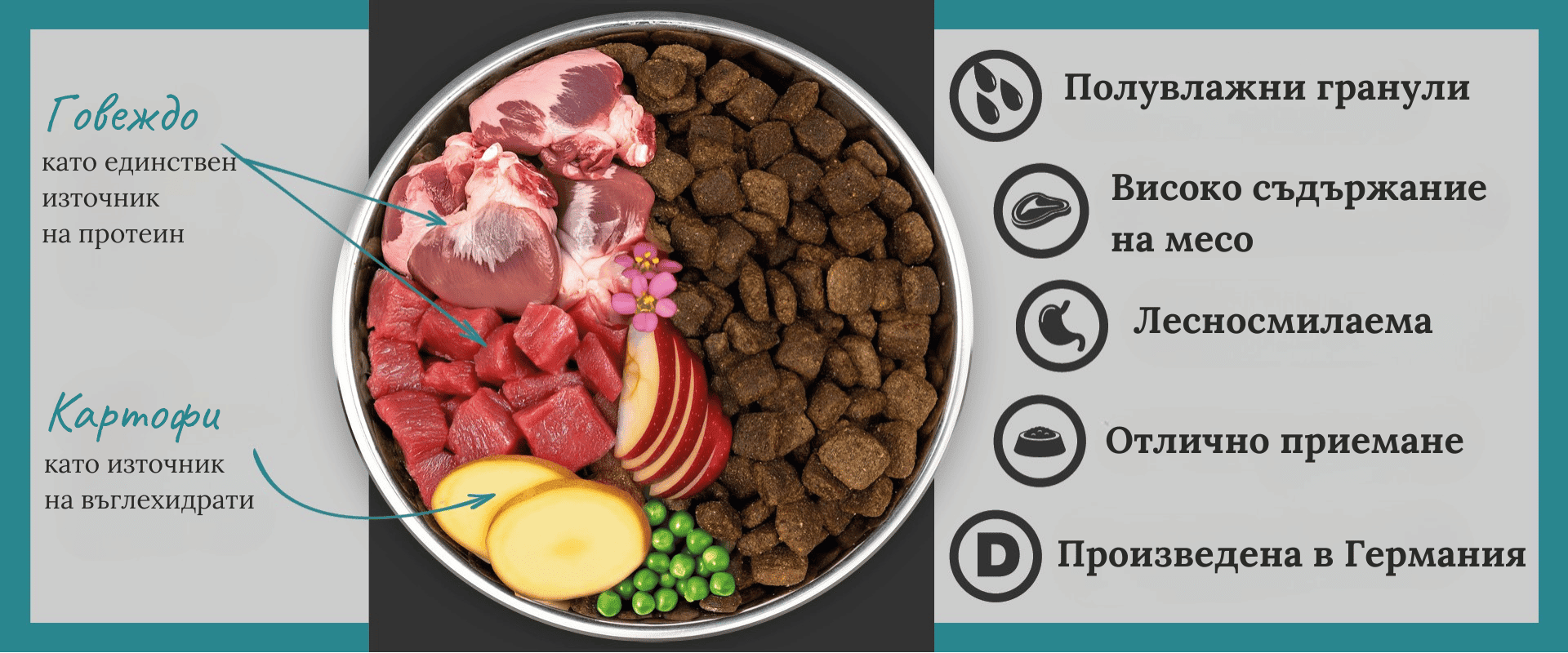 - 50% говеждо месо: Висококачествени протеини за мускулна маса и енергия.